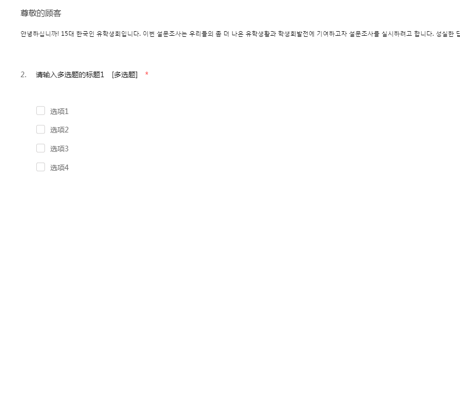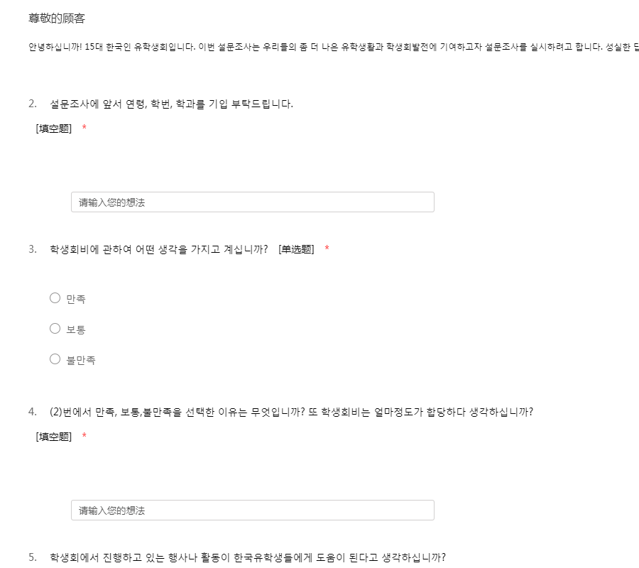 안녕하십니까! 15대 한국인 유학생회입니다. 이번 설문조사는 우리들의 좀 더 나은 유학생활과 학생회발전에 기여하고자 설문조사를 실시하려고 합니다. 성실한 답변 부탁드립니다.