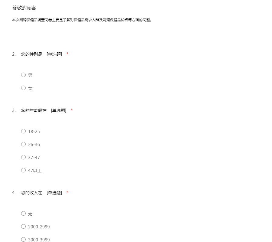 本次网购保健品调查问卷主要是了解对保健品需求人群及网购保健品价格等方面的问题。