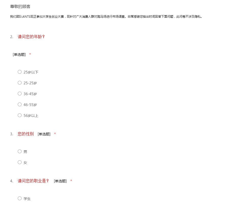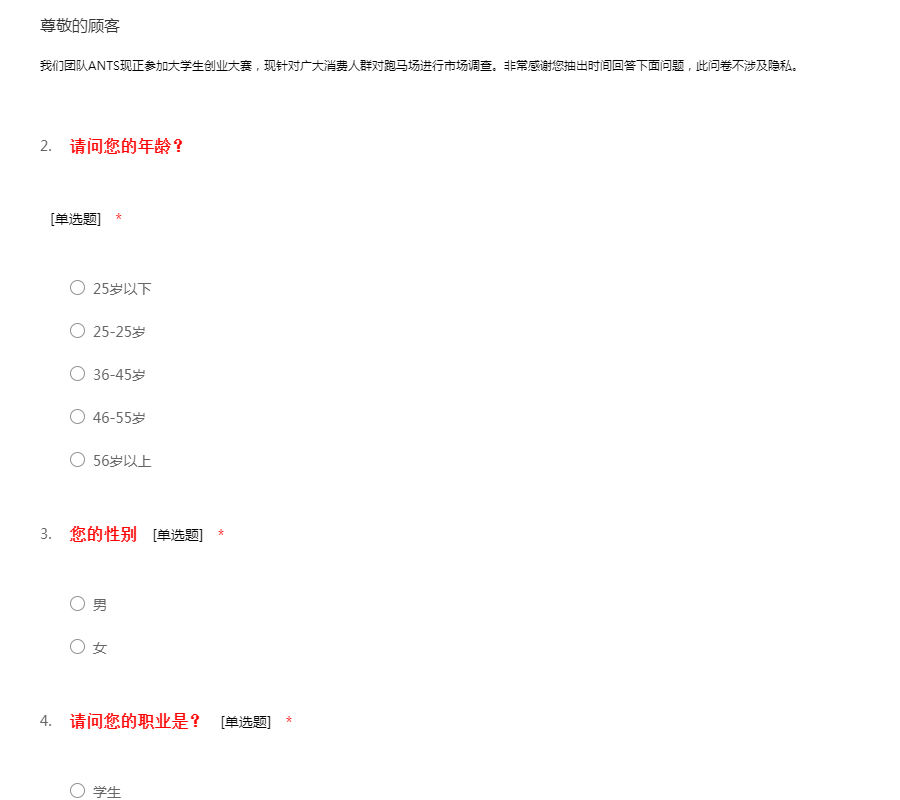 我们团队ANTS现正参加大学生创业大赛,现针对广大消费人群对跑马场进行市场调查。非常感谢您抽出时间回答下面问题,此问卷不涉及隐私。