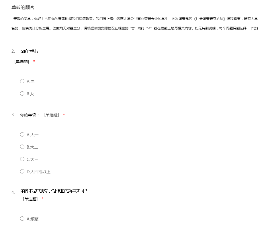 亲爱的同学,你好!占用你的宝贵时间我们深感歉意。我们是上海中医药大学公共事业管理专业的学生,此次调查是因《社会调查研究方法》课程需要,研究大学生平时对课程小组作业分工的状况。调查是不记名的,仅供统计分析之用。答案均无对错之分,请根据你的实际情况在相应的“□”内打“√”或在横线上填写相关内容。如无特别说明,每个问题只能选择一个答案。感谢你的合作!