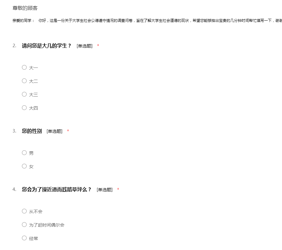 亲爱的同学: 你好,这是一份关于大学生社会公德遵守情况的调查问卷,旨在了解大学生社会道德的现状,希望您能够抽出宝贵的几分钟时间帮忙填写一下,谢谢!