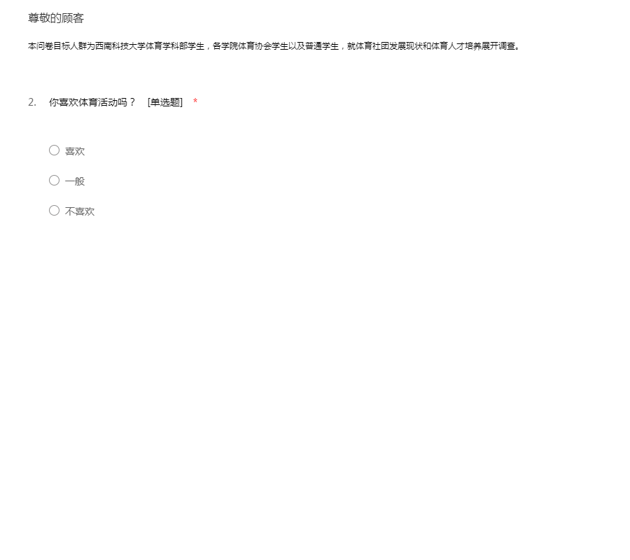 本问卷目标人群为西南科技大学体育学科部学生,各学院体育协会学生以及普通学生,就体育社团发展现状和体育人才培养展开调查。