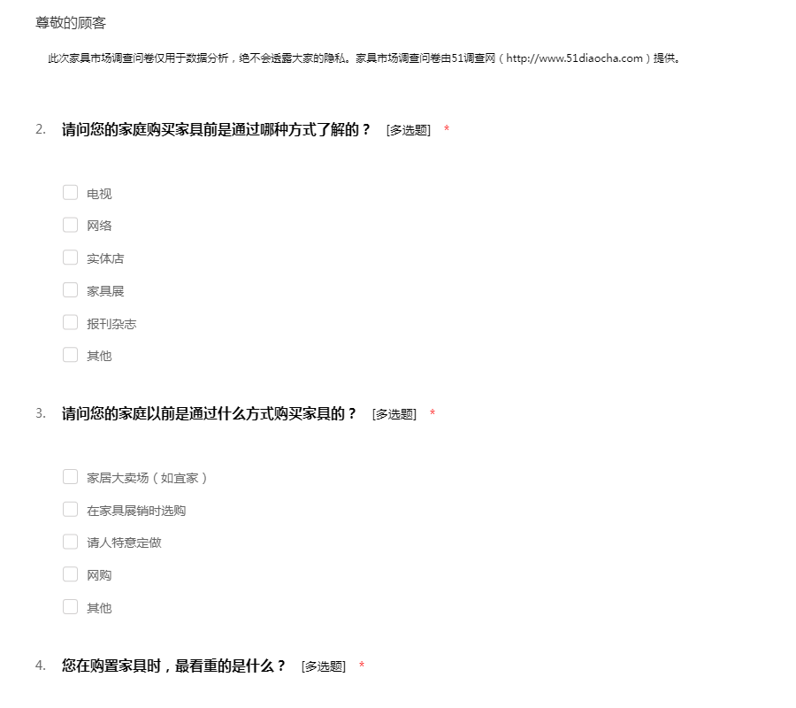 此次家具市场调查问卷仅用于数据分析,绝不会透露大家的隐私。家具市场调查问卷由51调查网(http://www.51diaocha.com)提供。