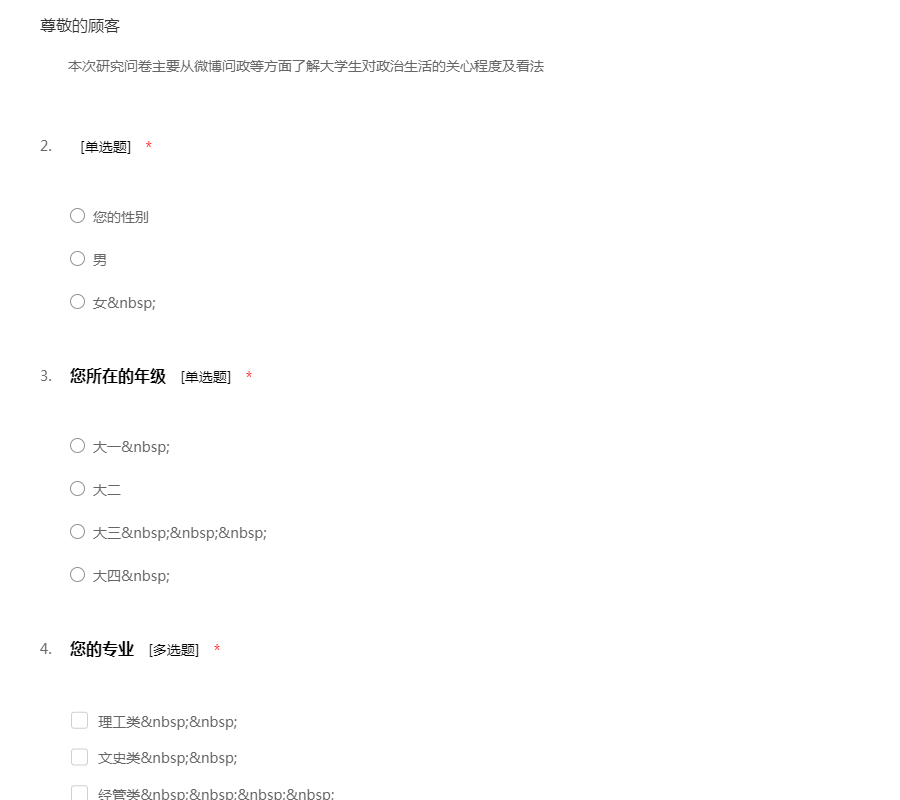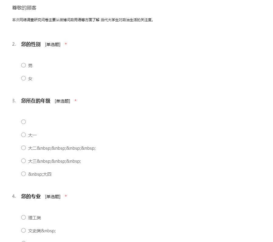 本次网络调查研究问卷主要从微博问政用语等方面了解 当代大学生对政治生活的关注度。