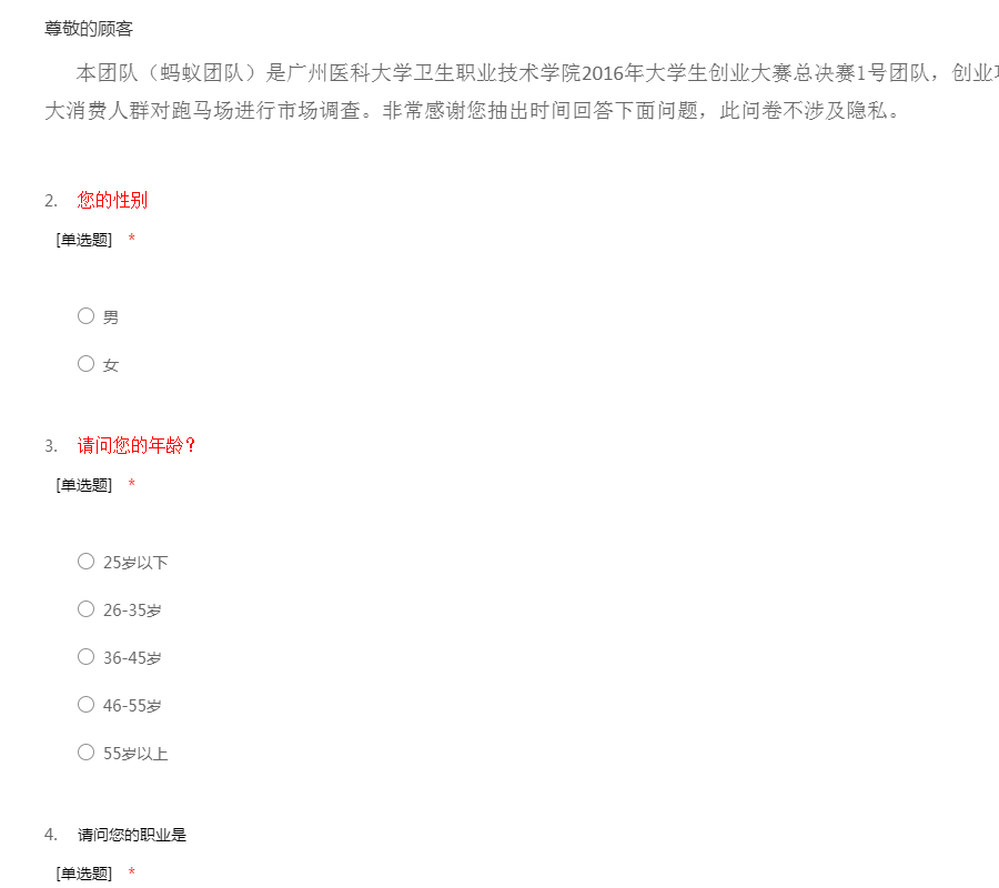 本团队(蚂蚁团队)是广州医科大学卫生职业技术学院2016年大学生创业大赛总决赛1号团队,创业项目是追风跑马场,现针对广大消费人群对跑马场进行市场调查。非常感谢您抽出时间回答下面问题,此问卷不涉及隐私。