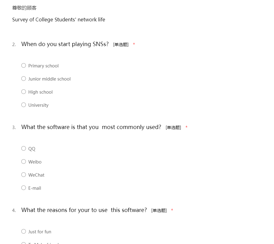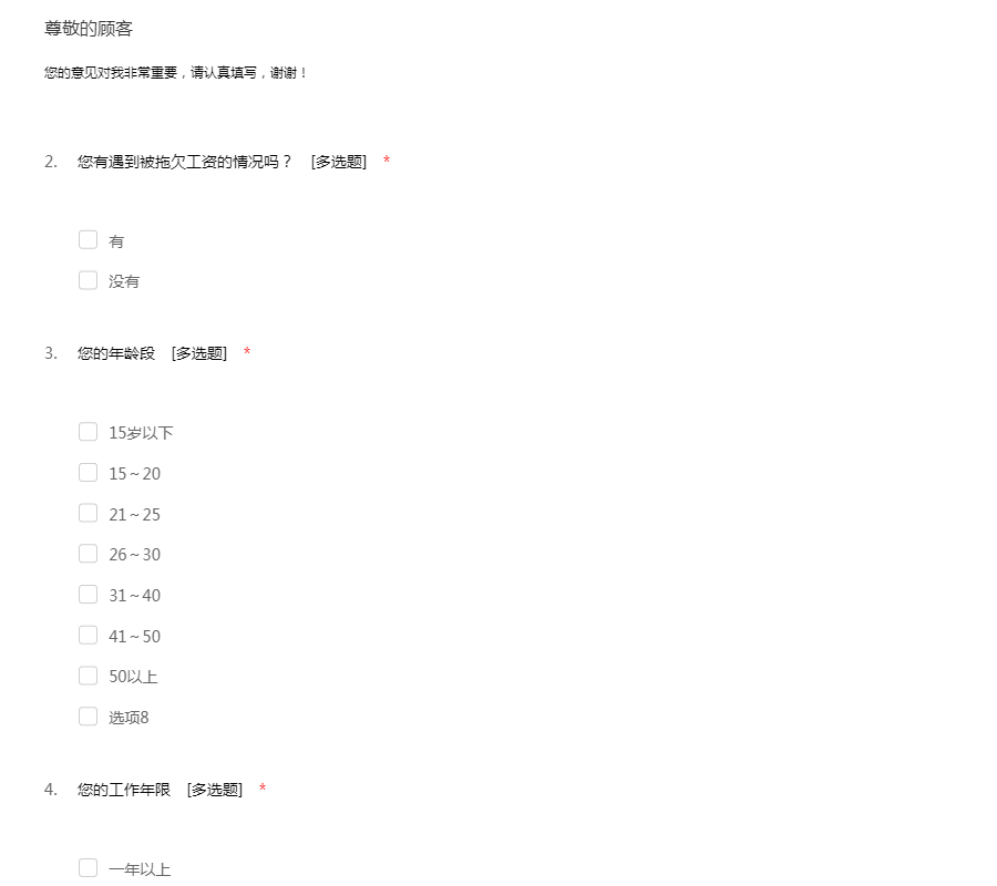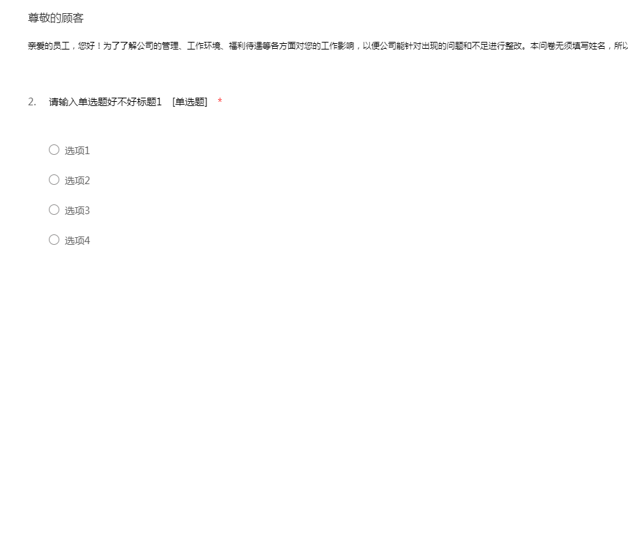亲爱的员工,您好!为了了解公司的管理、工作环境、福利待遇等各方面对您的工作影响,以便公司能针对出现的问题和不足进行整改。本问卷无须填写姓名,所以请放心的如实填写。感谢您的配合!