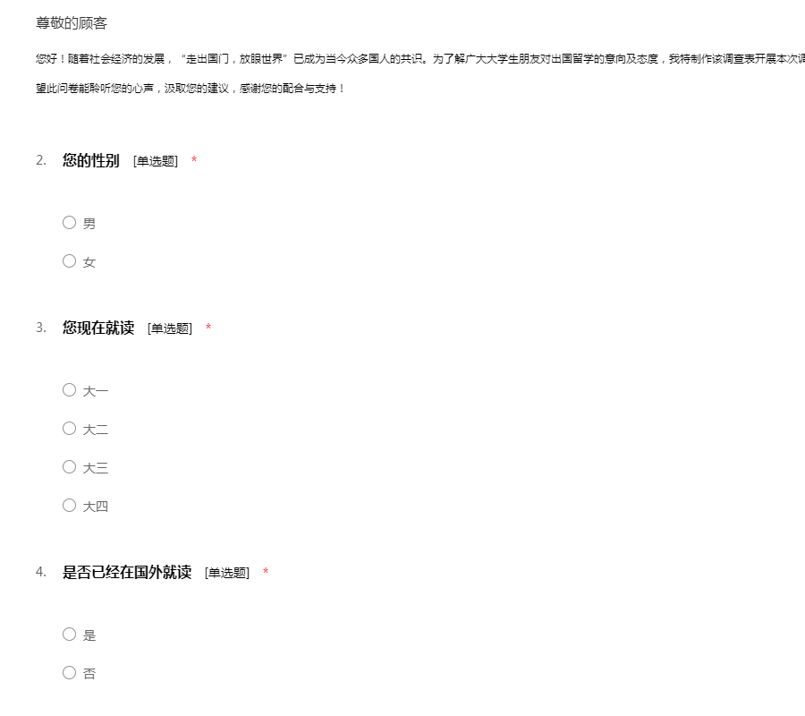 您好!随着社会经济的发展,“走出国门,放眼世界”已成为当今众多国人的共识。为了解广大大学生朋友对出国留学的意向及态度,我特制作该调查表开展本次调查工作。本人也是中国海洋大学的一名学生,希望此问卷能聆听您的心声,汲取您的建议,感谢您的配合与支持!