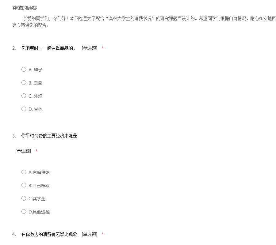 亲爱的同学们,你们好!本问卷是为了配合“高校大学生的消费状况”的研究课题而设计的,希望同学们根据自身情况,耐心如实地回答。我们承诺,绝对不会泄露个人信息!衷心感谢您的配合。