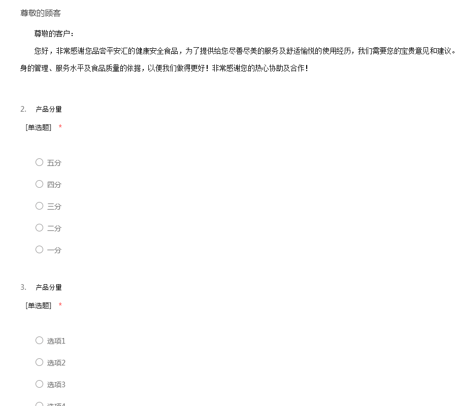 尊敬的客户: 您好,非常感谢您品尝平安汇的健康安全食品,为了提供给您尽善尽美的服务及舒适愉悦的使用经历,我们需要您的宝贵意见和建议。客户意见信息的有效获取,是我们提高自身的管理、服务水平及食品质量的依据,以便我们做得更好!非常感谢您的热心协助及合作!