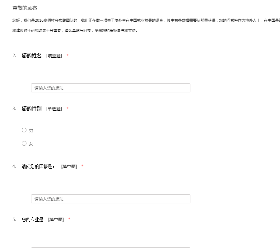 您好,我们是2016寒假社会实践团队的,我们正在做一项关于境外生在中国就业前景的调查,其中有些数据需要从那里获得,您的问卷将作为境外人士,在中国是否有意愿就业的统计和建议依据使用。您的研究和建议对于研究结果十分重要,请认真填写问卷,感谢您的积极参与和支持。