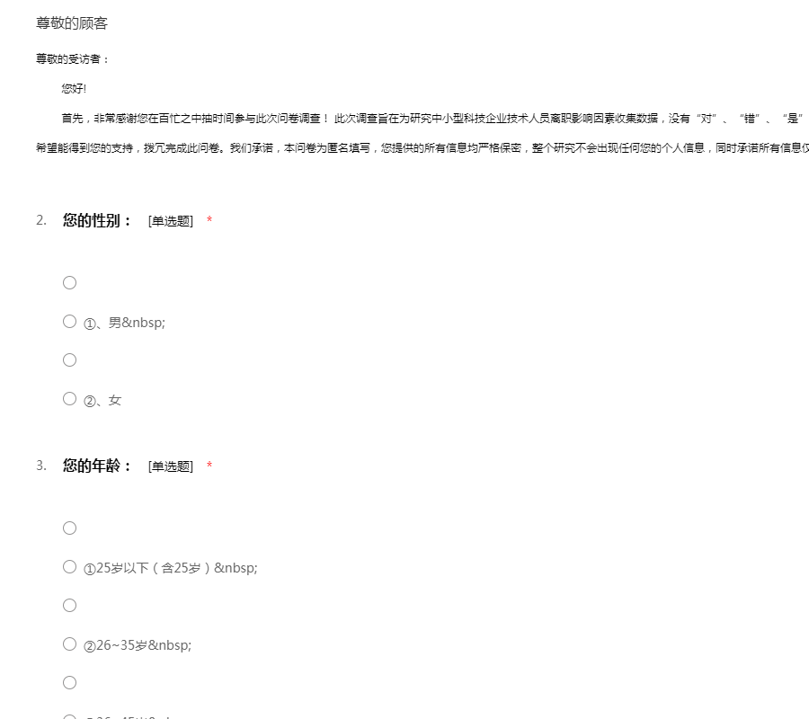 尊敬的受访者: 您好! 首先,非常感谢您在百忙之中抽时间参与此次问卷调查! 此次调查旨在为研究中小型科技企业技术人员离职影响因素收集数据,没有“对”、“错”、“是”、“非”之分,大约需要占用您5-10分钟时间,希望能得到您的支持,拨冗完成此问卷。我们承诺,本问卷为匿名填写,您提供的所有信息均严格保密,整个研究不会出现任何您的个人信息,同时承诺所有信息仅供本次研究使用,您可以放心填写。