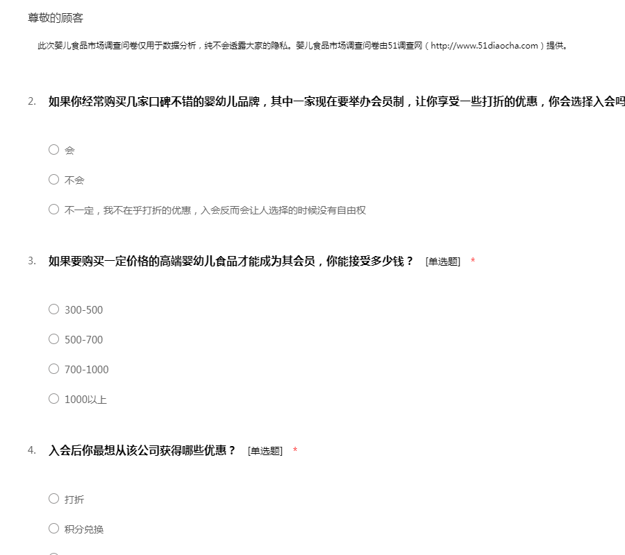 此次婴儿食品市场调查问卷仅用于数据分析,纯不会透露大家的隐私。婴儿食品市场调查问卷由51调查网(http://www.51diaocha.com)提供。