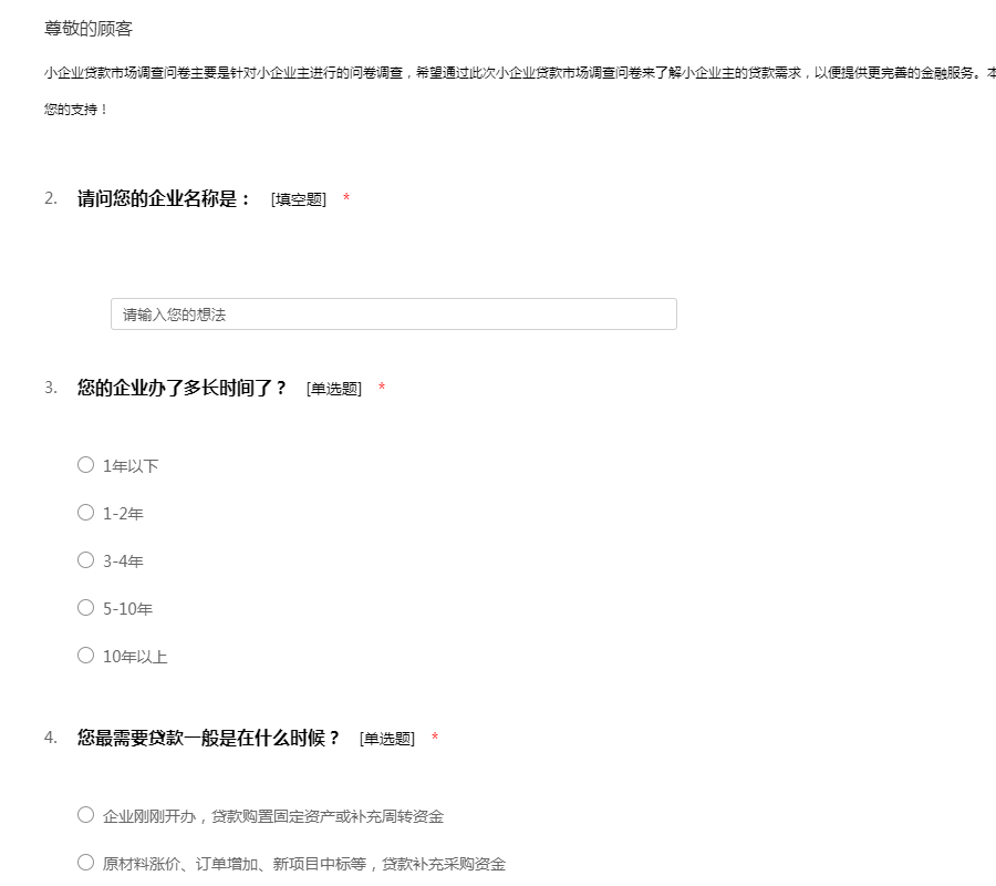 小企业贷款市场调查问卷主要是针对小企业主进行的问卷调查,希望通过此次小企业贷款市场调查问卷来了解小企业主的贷款需求,以便提供更完善的金融服务。本次调查大约需占用您 3 -5 分钟时间,非常感谢您的支持!