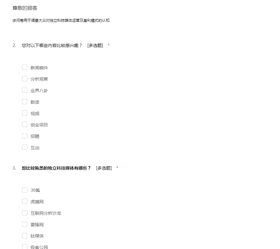 该问卷用于调查大众对独立科技媒体运营及盈利模式的认知