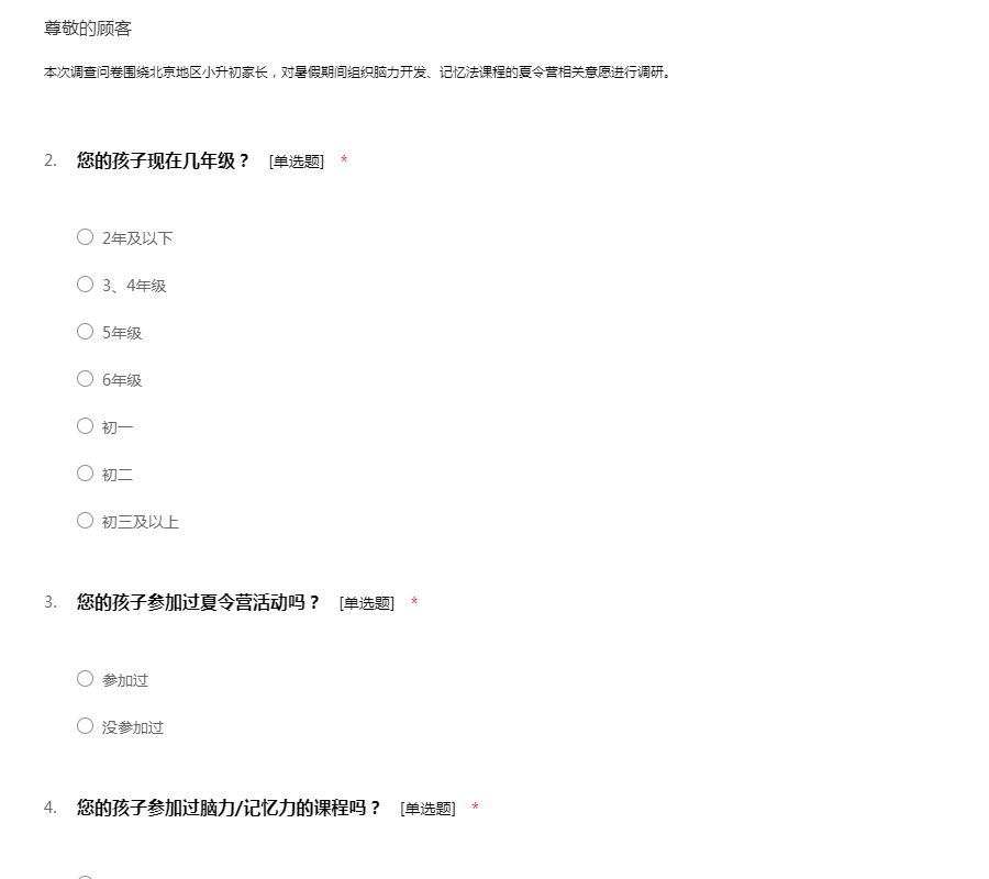 本次调查问卷围绕北京地区小升初家长,对暑假期间组织脑力开发、记忆法课程的夏令营相关意愿进行调研。