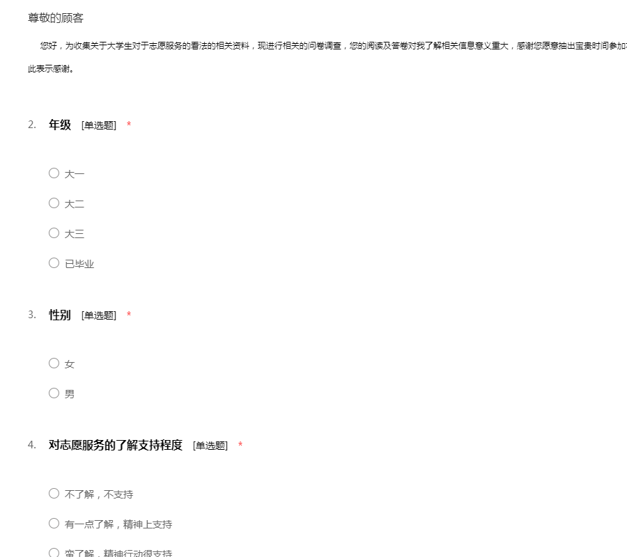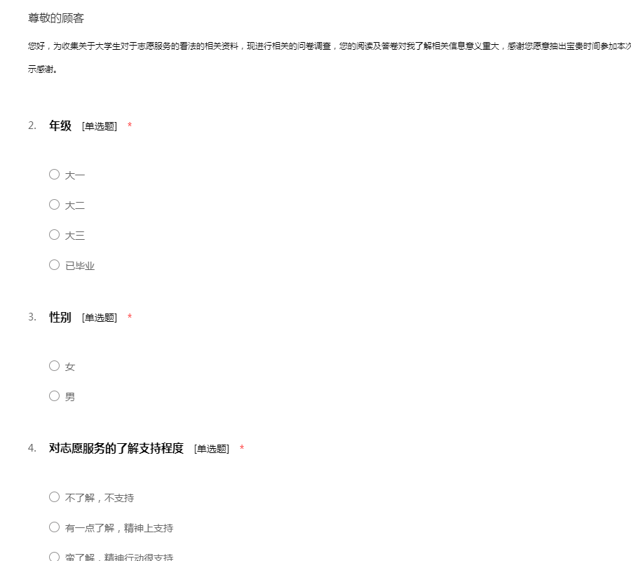 您好,为收集关于大学生对于志愿服务的看法的相关资料,现进行相关的问卷调查,您的阅读及答卷对我了解相关信息意义重大,感谢您愿意抽出宝贵时间参加本次问卷。此卷为匿名制参与,请放心填写,在此表示感谢。