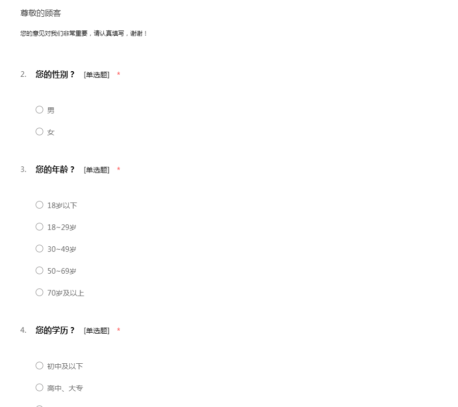 请您结合实际情况回答如下问题,您的意见对我们非常重要,请认真填写,问卷调查的完整性和真实性是我们获得真实和可靠数据的保证,感谢您的参与和支持。