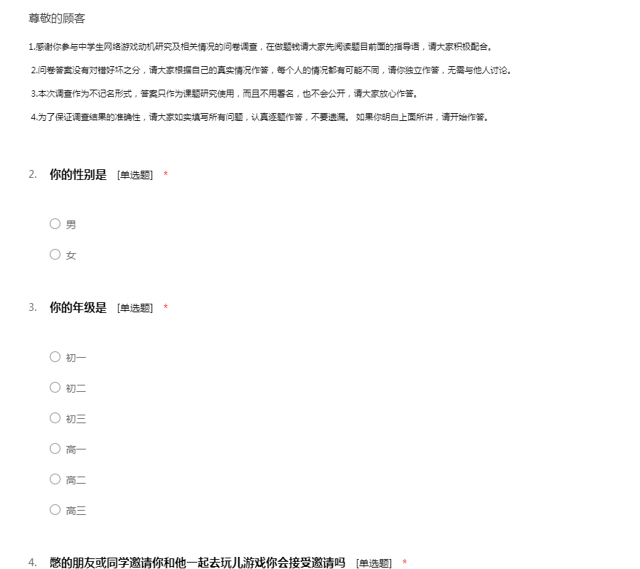 1.感谢你参与中学生网络游戏动机研究及相关情况的问卷调查,在做题钱请大家先阅读题目前面的指导语,请大家积极配合。 2.问卷答案没有对错好坏之分,请大家根据自己的真实情况作答,每个人的情况都有可能不同,请你独立作答,无需与他人讨论。 3.本次调查作为不记名形式,答案只作为课题研究使用,而且不用署名,也不会公开,请大家放心作答。 4.为了保证调查结果的准确性,请大家如实填写所有问题,认真逐题作答,不要遗漏。 如果你明白上面所讲,请开始作答。