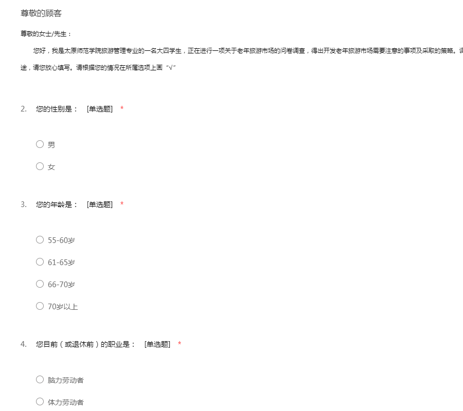 尊敬的女士/先生: 您好,我是太原师范学院旅游管理专业的一名大四学生,正在进行一项关于老年旅游市场的问卷调查,得出开发老年旅游市场需要注意的事项及采取的策略。调查结果仅用于本人的毕业论文撰写,绝非商业用途,请您放心填写。请根据您的情况在所属选项上画“√”