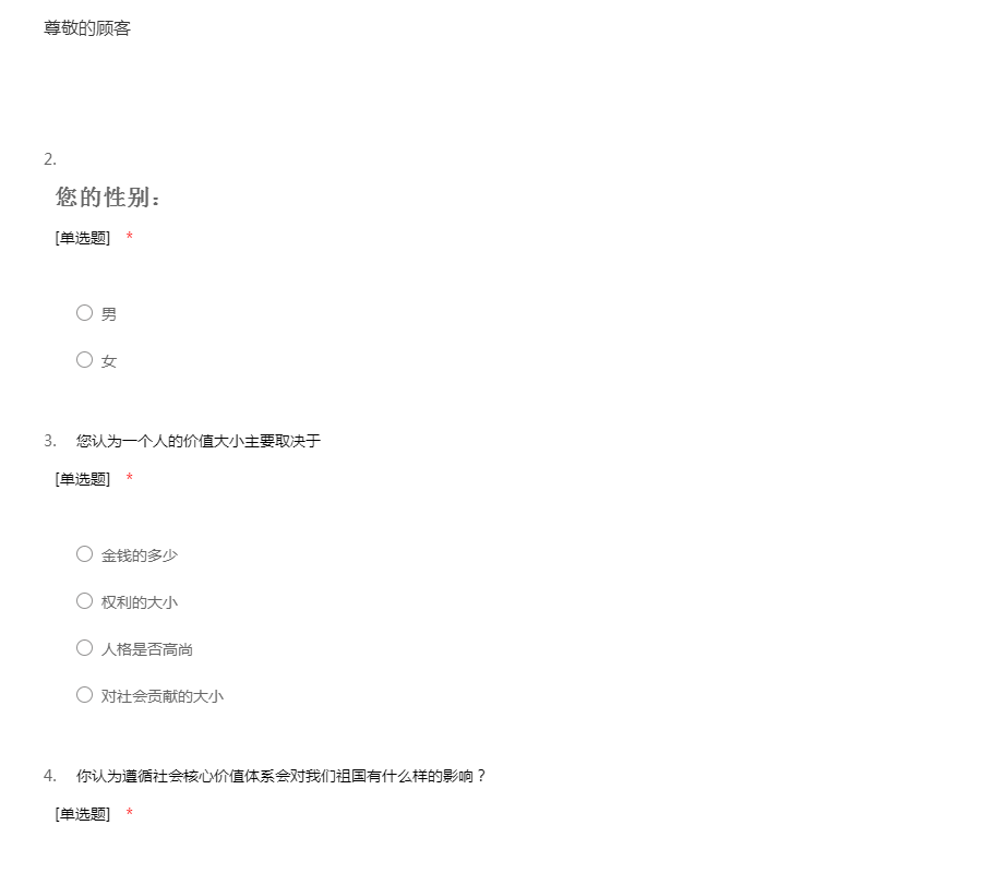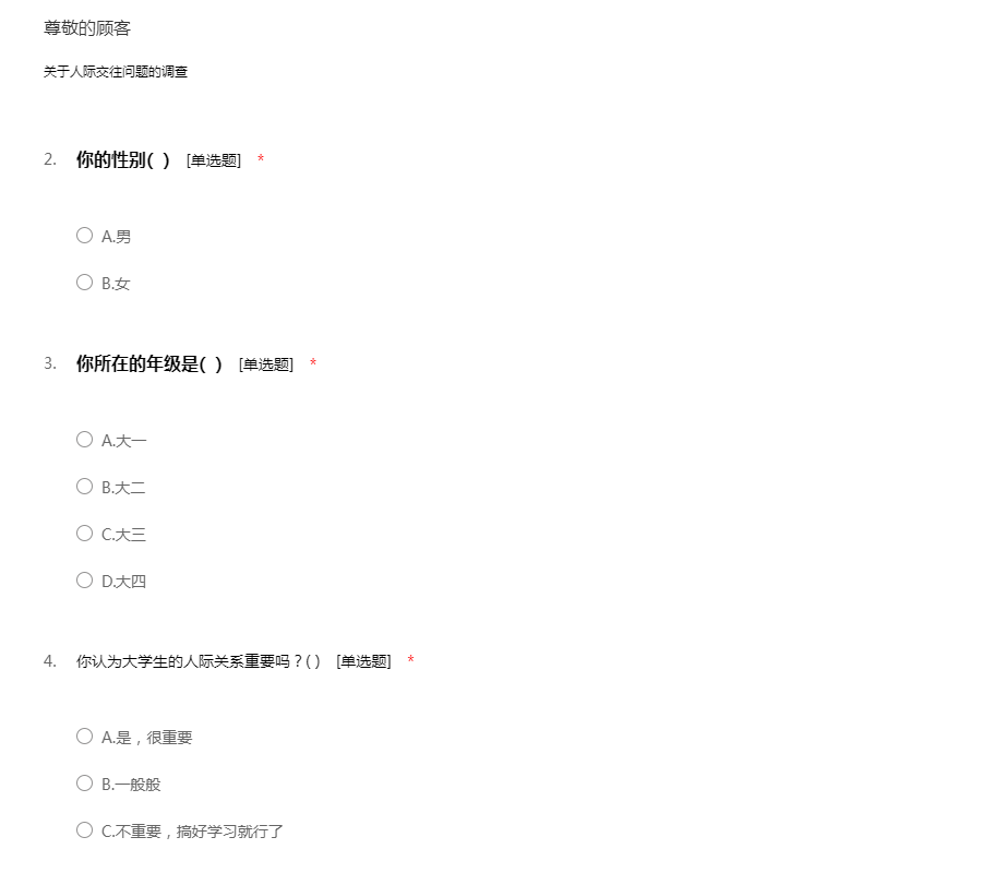 ——亲爱的同学,你好!我们现在展开一项学生对就业问题情况的调查。作为一名在校大学生的你,对本次问卷中的问题最具发言权,你的答案将对我们非常重要。在此,向你致以诚挚的谢意!