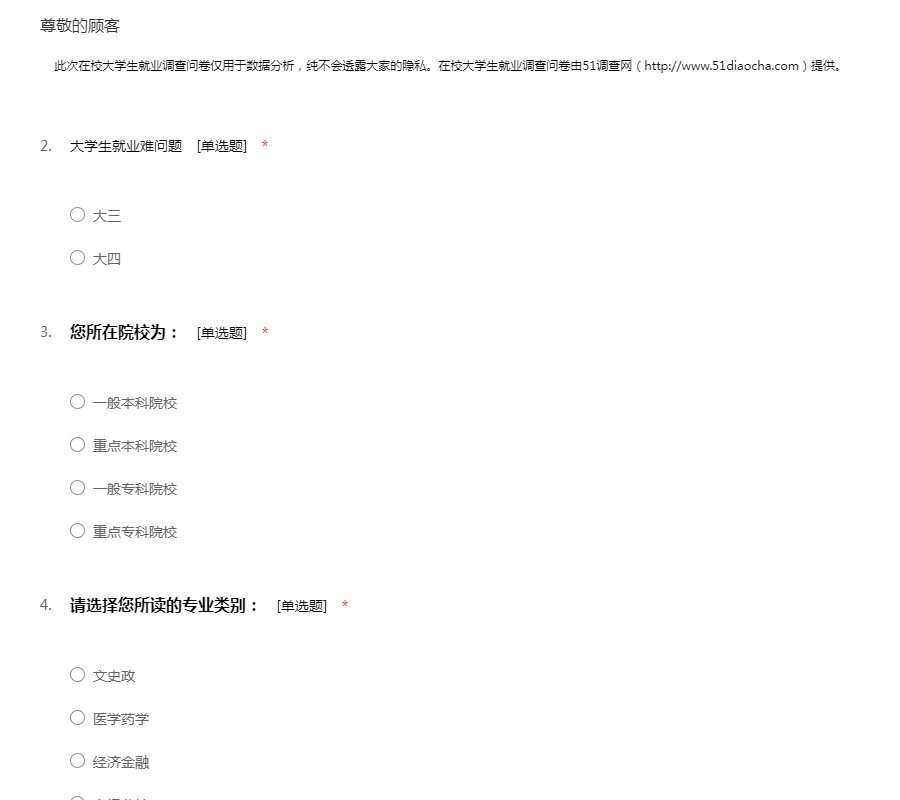 此次在校大学生就业调查问卷仅用于数据分析,纯不会透露大家的隐私。在校大学生就业调查问卷由51调查网(http://www.51diaocha.com)提供。