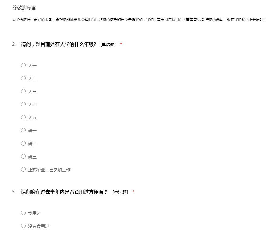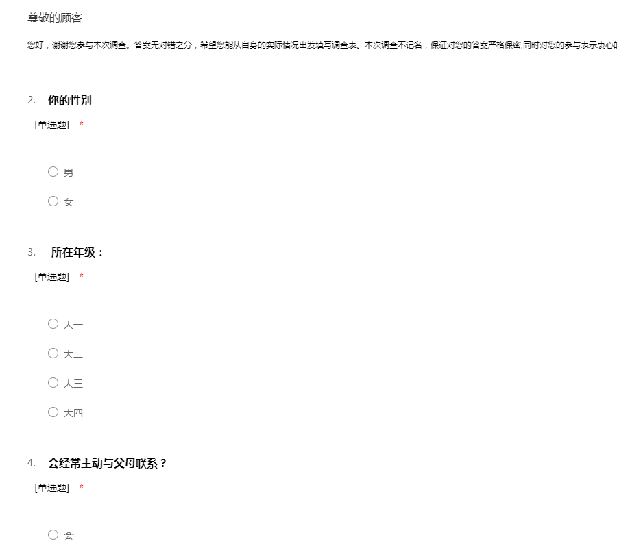 您好,谢谢您参与本次调查。答案无对错之分,希望您能从自身的实际情况出发填写调查表。本次调查不记名,保证对您的答案严格保密,同时对您的参与表示衷心的感谢。