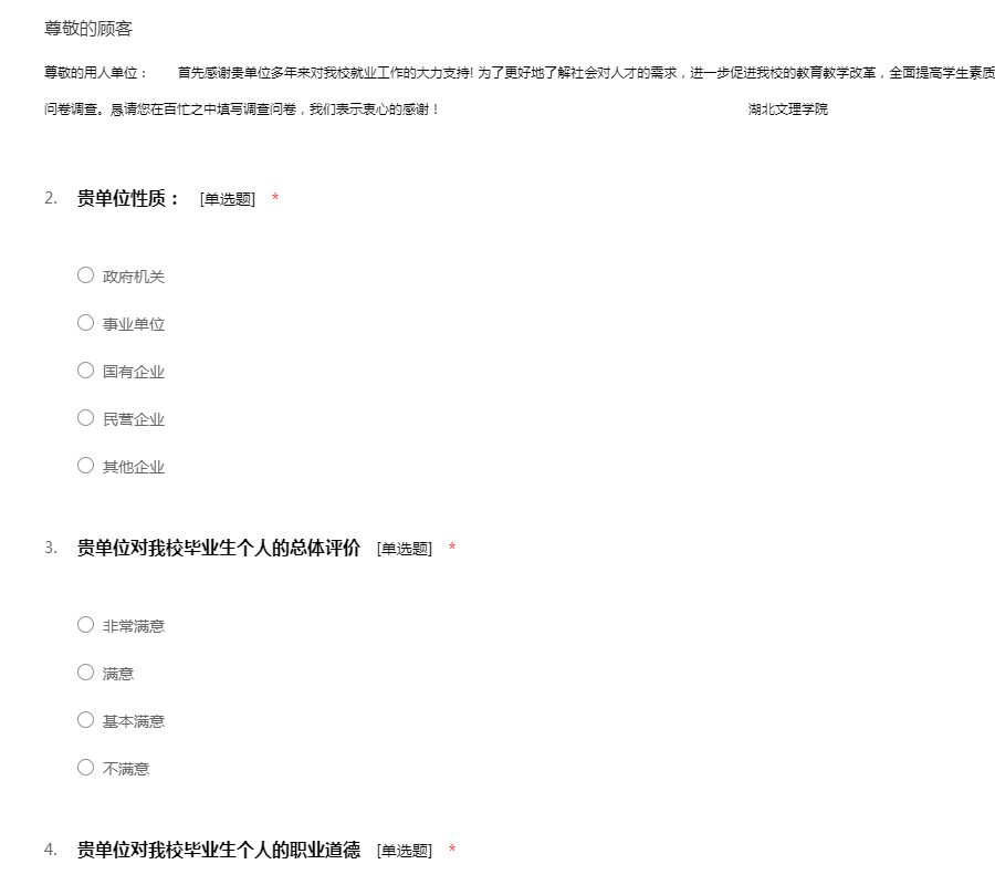 尊敬的用人单位: 首先感谢贵单位多年来对我校就业工作的大力支持! 为了更好地了解社会对人才的需求,进一步促进我校的教育教学改革,全面提高学生素质,更好地为用人单位服务,我们组织开展了本次问卷调查。恳请您在百忙之中填写调查问卷,我们表示衷心的感谢! 湖北文理学院 2016年2月20日