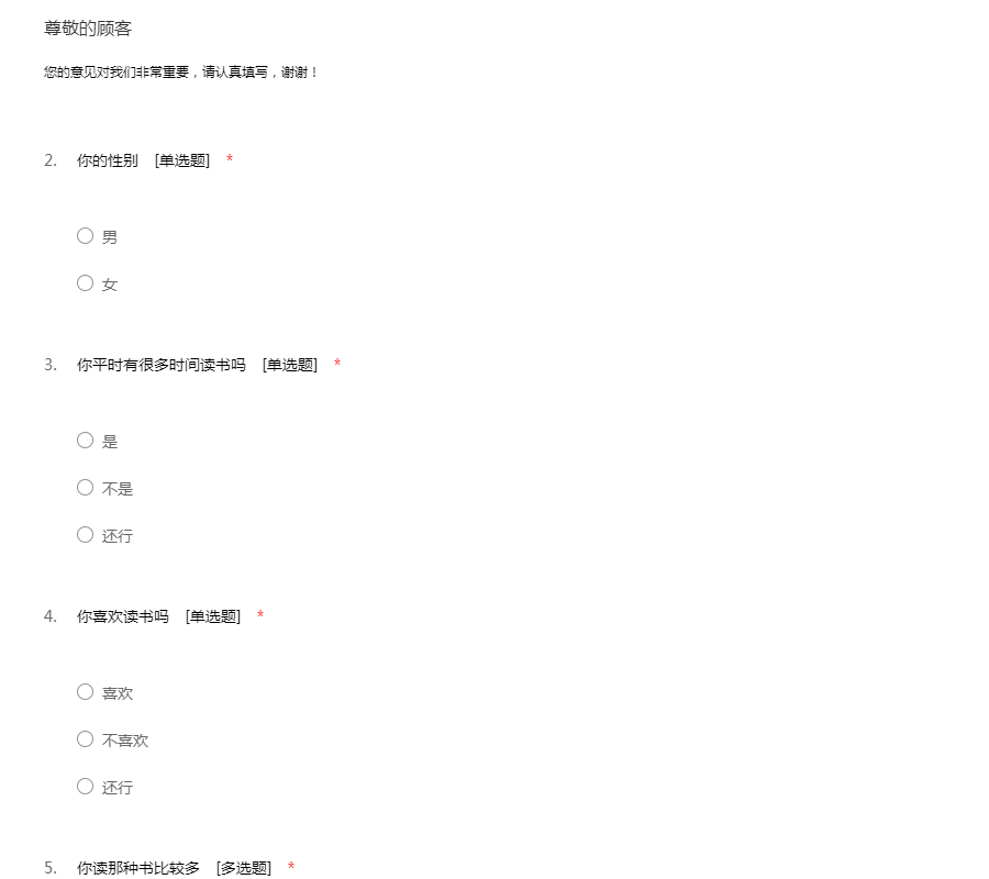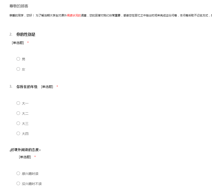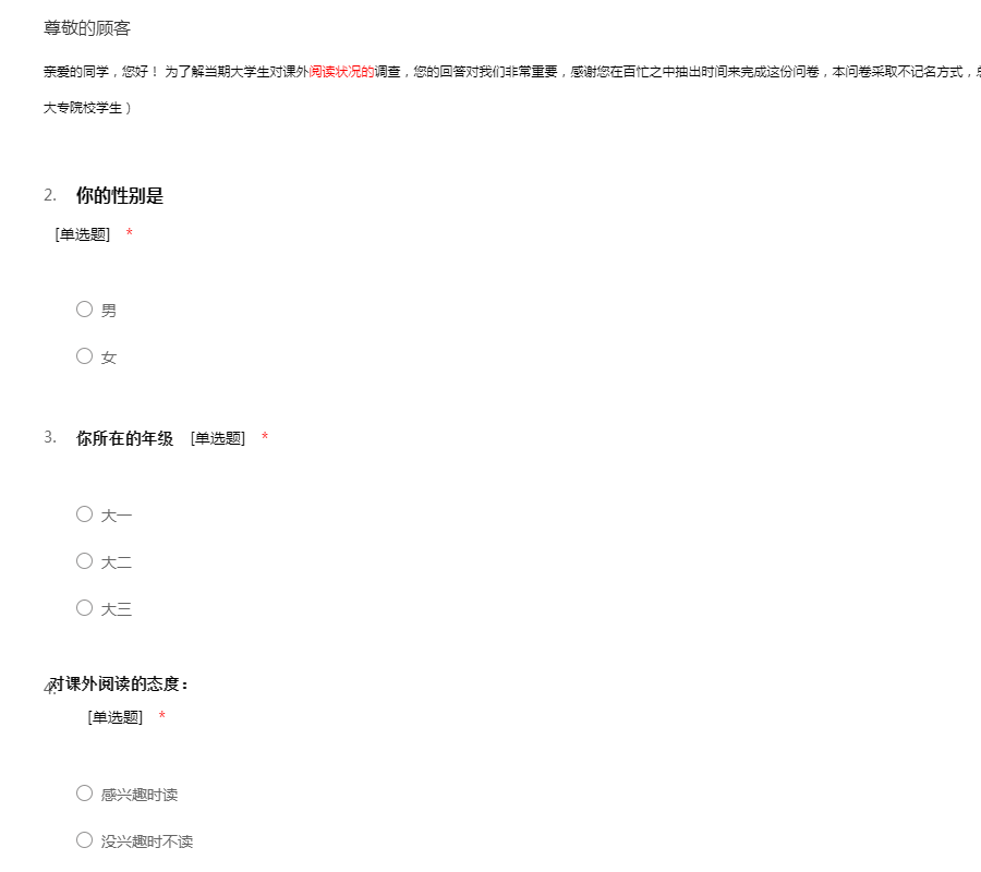 亲爱的同学,您好! 为了解当期大学生对课外阅读状况的调查,您的回答对我们非常重要,感谢您在百忙之中抽出时间来完成这份问卷,本问卷采取不记名方式,总共20题,感想您的参与!(此问卷调查对象为大专院校学生)