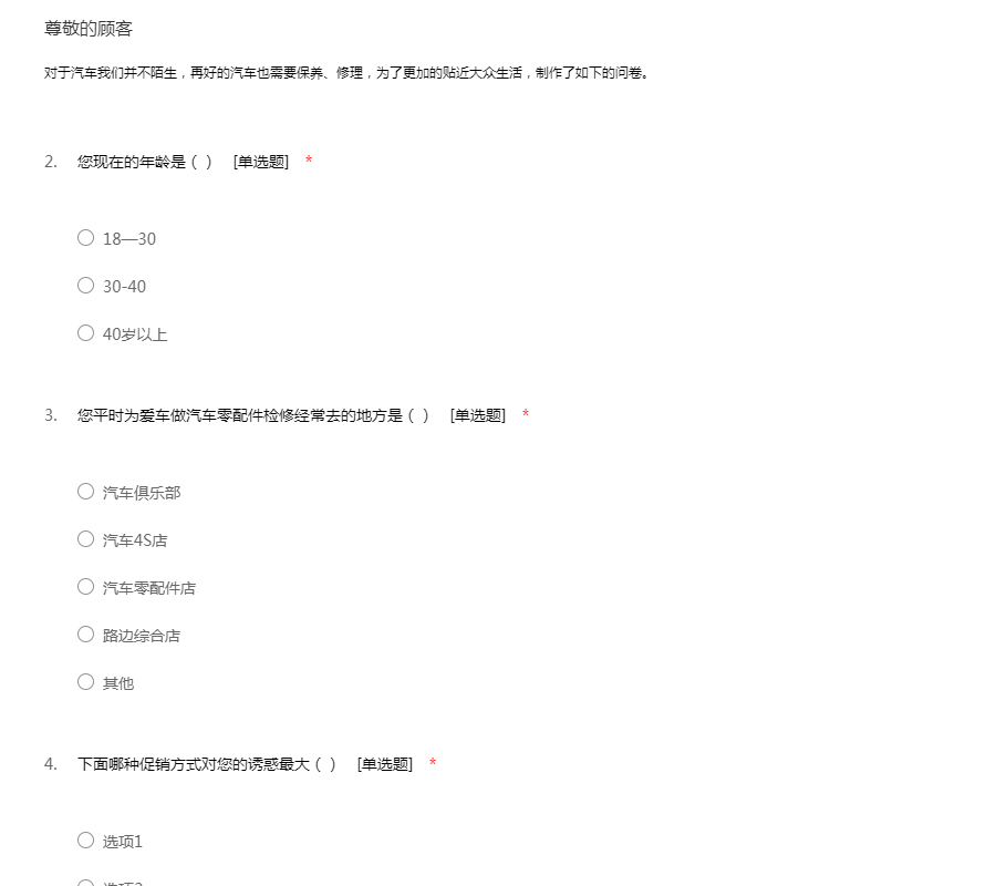 对于汽车我们并不陌生,再好的汽车也需要保养、修理,为了更加的贴近大众生活,制作了如下的问卷。