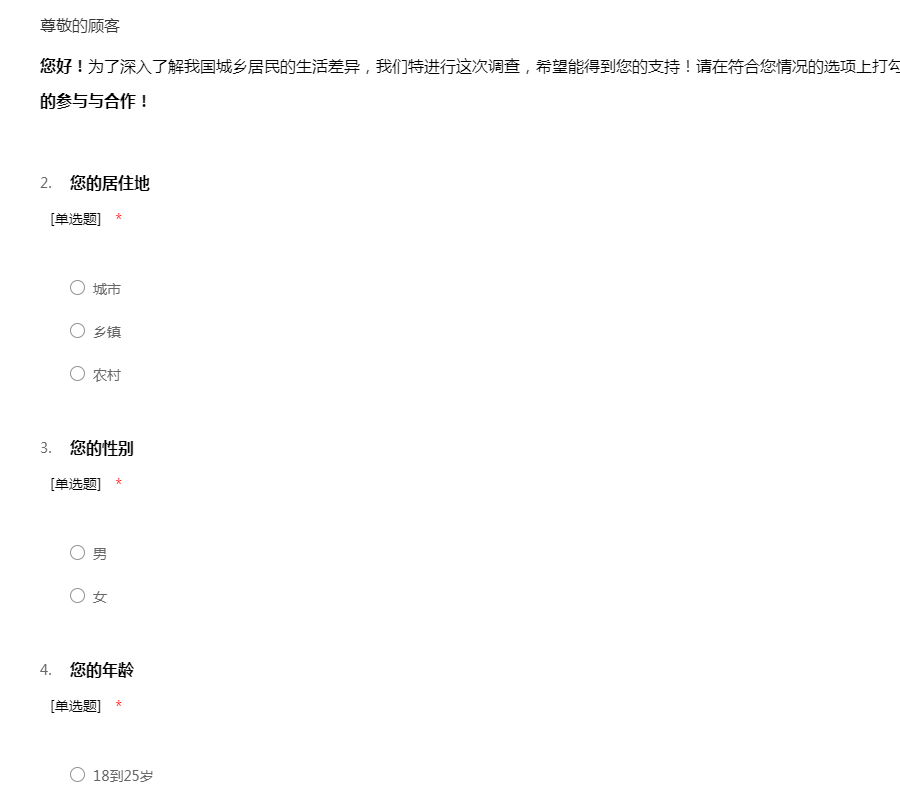 您好!为了深入了解我国城乡居民的生活差异,我们特进行这次调查,希望能得到您的支持!请在符合您情况的选项上打勾,部分题目可以多选,非常感谢您的参与与合作!