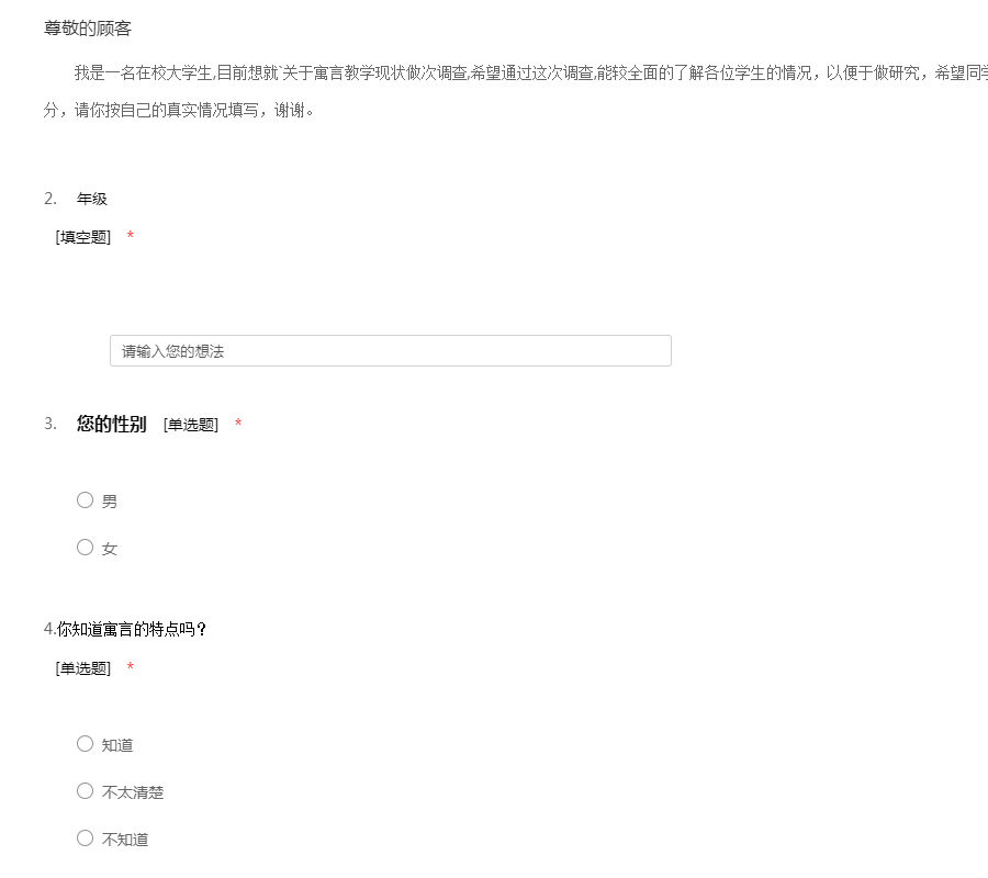 我是一名在校大学生,目前想就`关于寓言教学现状做次调查,希望通过这次调查,能较全面的了解各位学生的情况,以便于做研究,希望同学帮忙填答,这份问卷,答案无对错之分,请你按自己的真实情况填写,谢谢。