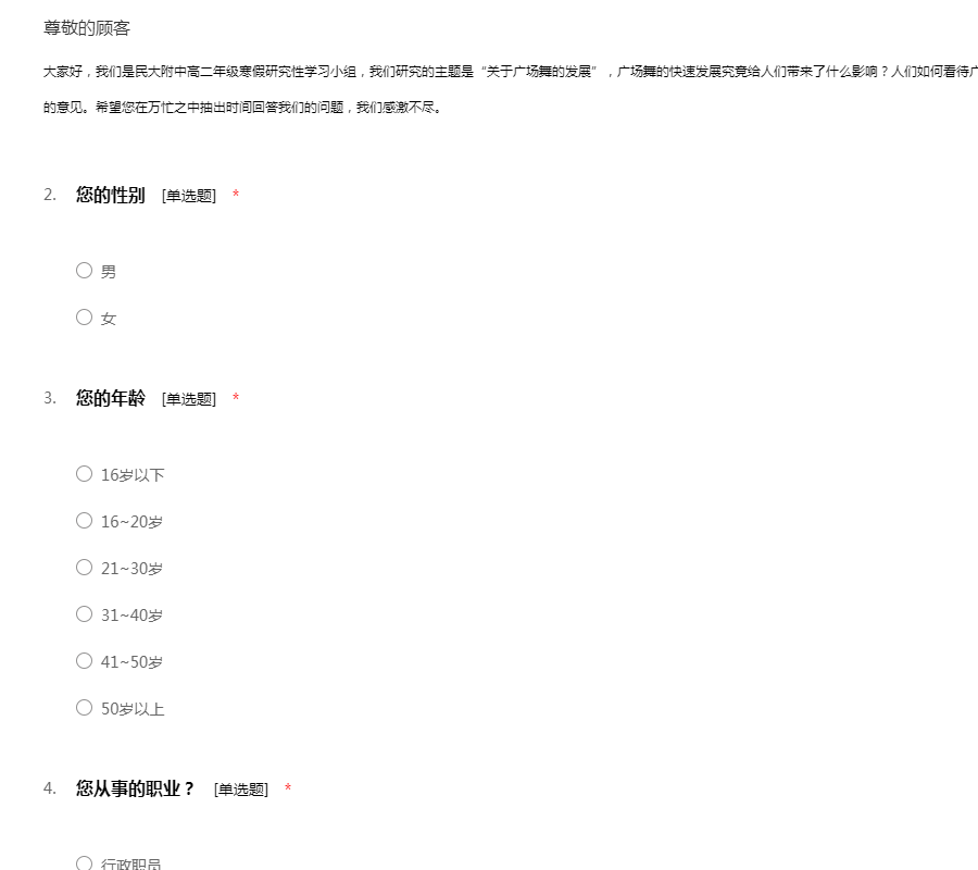 大家好,我们是民大附中高二年级寒假研究性学习小组,我们研究的主题是“关于广场舞的发展”,广场舞的快速发展究竟给人们带来了什么影响?人们如何看待广场舞的呢?我们希望通过这份调查问卷收集大家的意见。希望您在万忙之中抽出时间回答我们的问题,我们感激不尽。