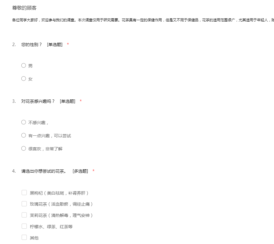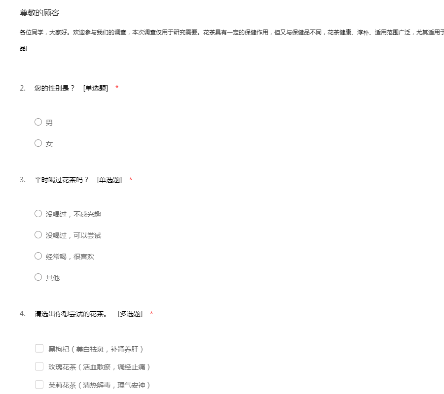 各位同学大家好,欢迎参与我们的调查。本次调查仅用于研究需要。花茶具有一定的保健作用,但是又不同于保健品,花茶的适用范围很广,尤其适用于年轻人,除了咖啡,花茶也是一种健康时尚的饮品!