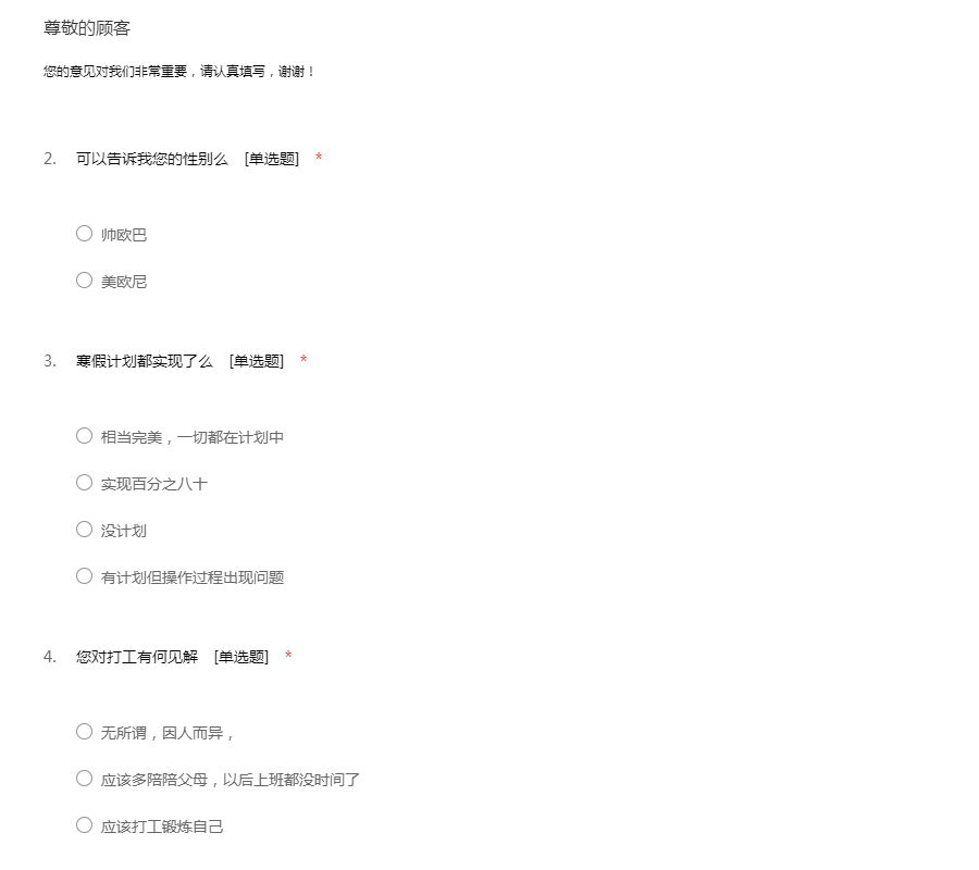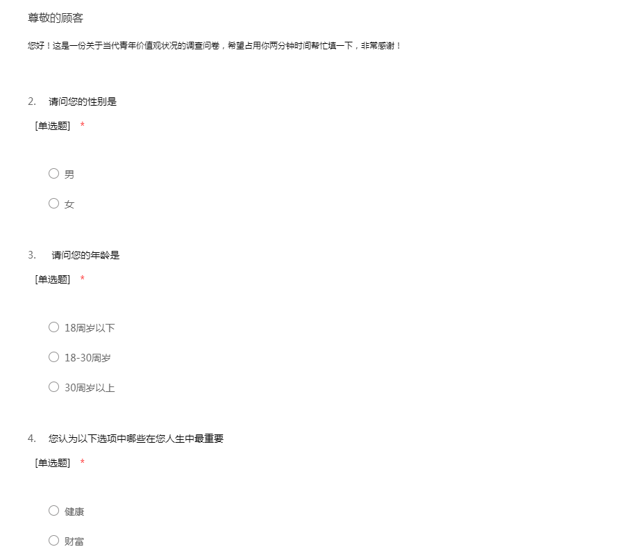 您好!这是一份关于当代青年价值观状况的调查问卷,希望占用你两分钟时间帮忙填一下,非常感谢!
