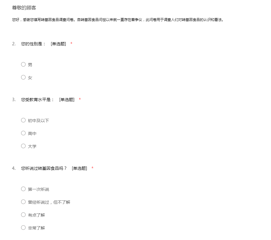 您好,感谢您填写转基因食品调查问卷。自转基因食品问世以来就一直存在着争议,此问卷用于调查人们对转基因食品的认识和看法。