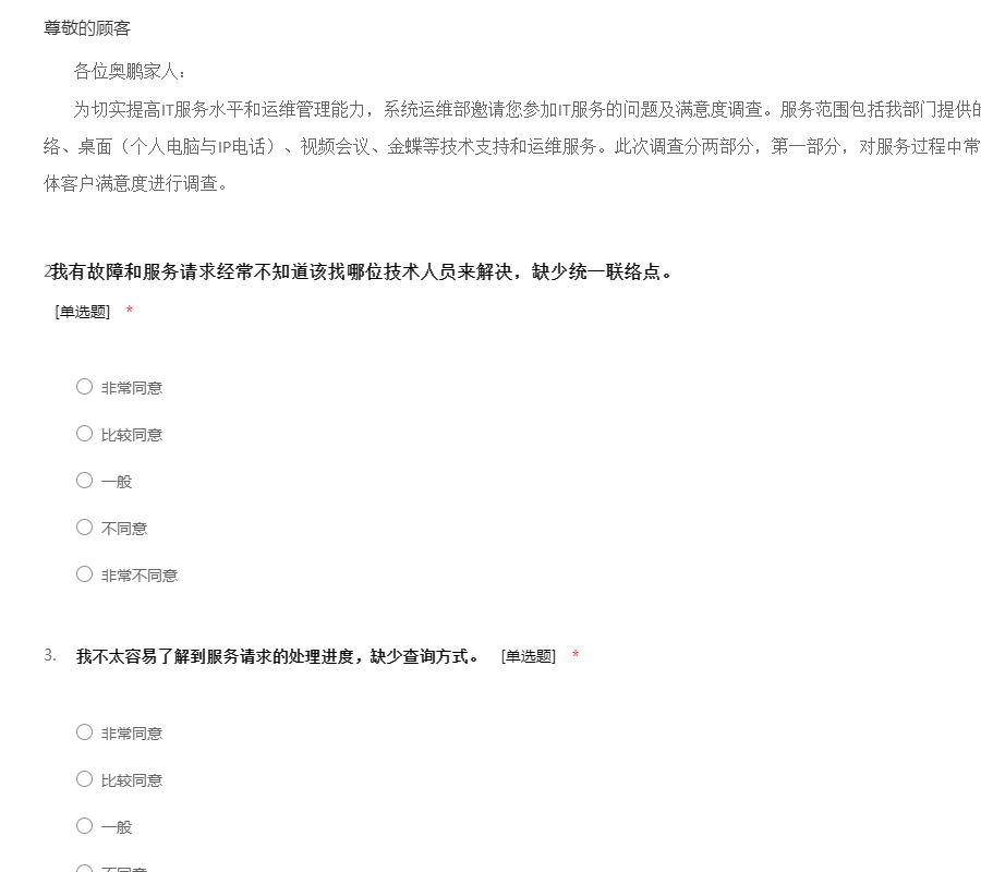 各位奥鹏家人: 为切实提高IT服务水平和运维管理能力,系统运维部邀请您参加IT服务的问题及满意度调查。服务范围包括我部门提供的应用系统和数据库、呼叫中心、网络、桌面(个人电脑与IP电话)、视频会议、金蝶等技术支持和运维服务。此次调查分两部分,第一部分,对服务过程中常见的问题进行调查;第二部分,对整体客户满意度进行调查。