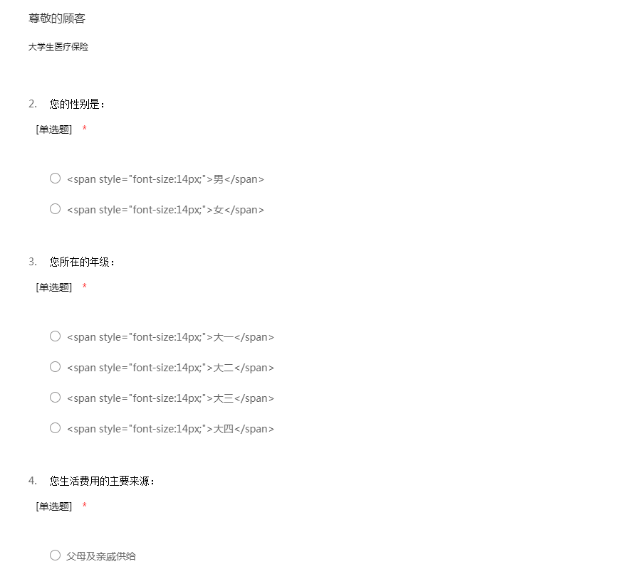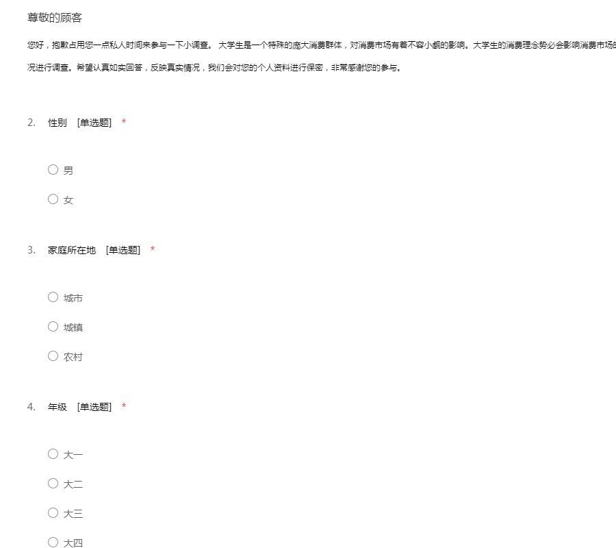 您好,抱歉占用您一点私人时间来参与一下小调查。 大学生是一个特殊的庞大消费群体,对消费市场有着不容小觑的影响。大学生的消费理念势必会影响消费市场的发展趋向。因此,我们希望就大学生的消费状况进行调查。希望认真如实回答,反映真实情况,我们会对您的个人资料进行保密,非常感谢您的参与。