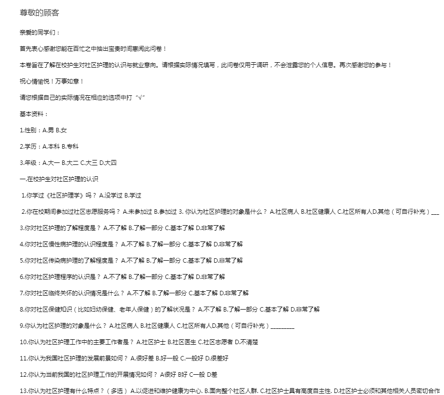 亲爱的同学们:首先衷心感谢您能在百忙之中抽出宝贵时间惠阅此问卷!本卷旨在了解在校护生对社区护理的认识与就业意向。请根据实际情况填写,此问卷仅用于调研,不会泄露您的个人信息。再次感谢您的参与!祝心情愉悦!万事如意!请您根据自己的实际情况在相应的选项中打“√”基本资料: 1.性别:A.男 B.女 2.学历:A.本科 B.专科 3.年级:A.大一 B.大二 C.大三 D.大四