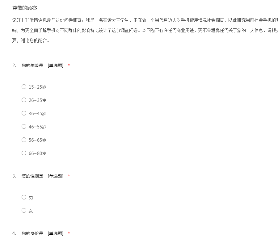 您好!非常感谢您参与这份问卷调查。我是一名在读大三学生,正在做一个当代身边人对手机使用情况社会调查,以此研究当前社会手机的普及给人们带来的不同方面不同程度的影响,为更全面了解手机对不同群体的影响特此设计了这份调查问卷。本问卷不存在任何商业用途,更不会泄露任何关于您的个人信息,请根据您的实际情况填写,您的意见十分重要,谢谢您的配合。