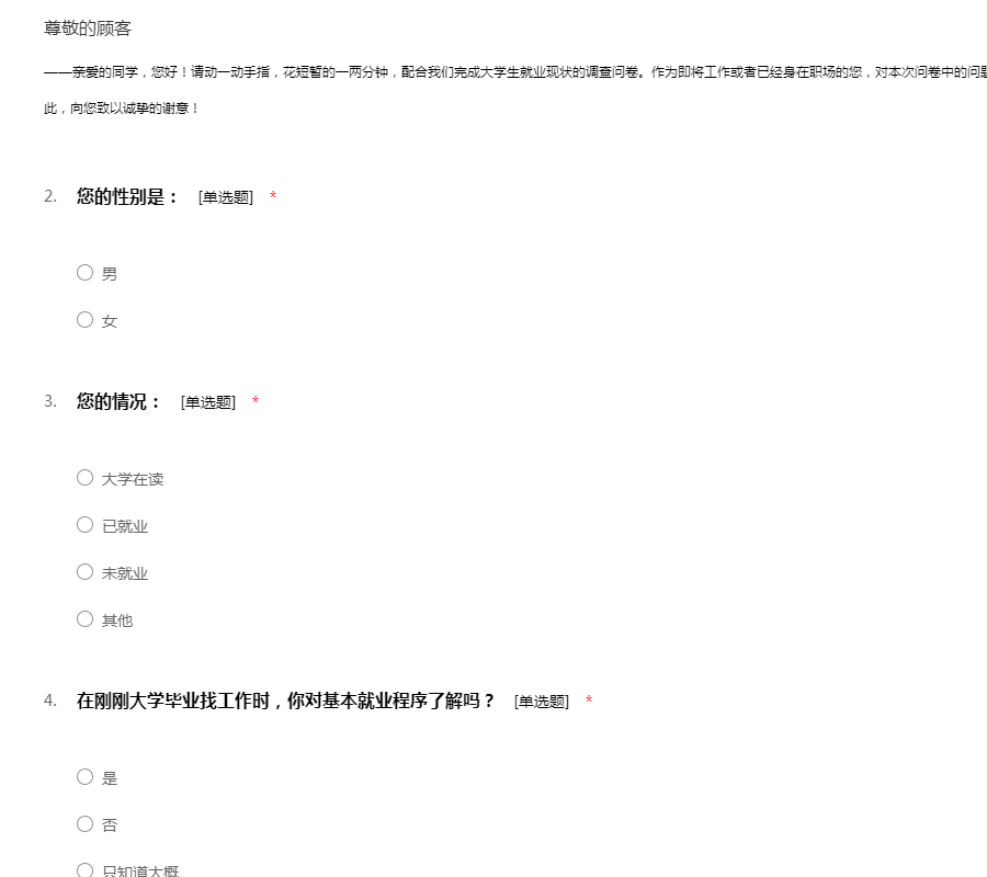 ——亲爱的同学,您好!请动一动手指,花短暂的一两分钟,配合我们完成大学生就业现状的调查问卷。作为即将工作或者已经身在职场的您,对本次问卷中的问题最具发言权,您的答案将对我们非常重要。在此,向您致以诚挚的谢意!