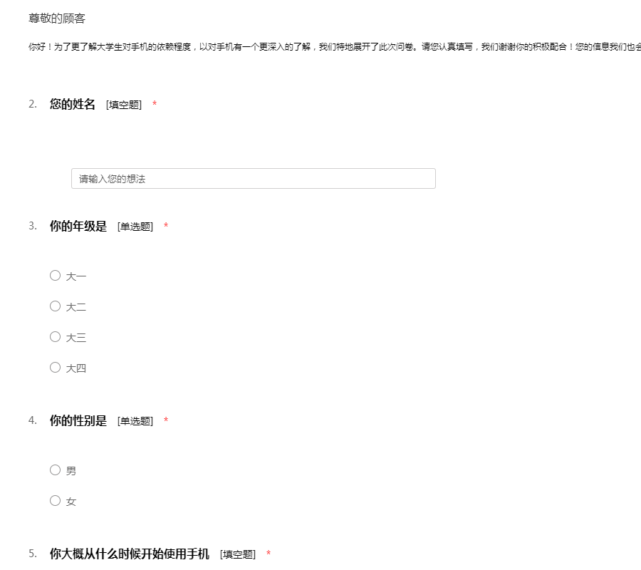 你好!为了更了解大学生对手机的依赖程度,以对手机有一个更深入的了解,我们特地展开了此次问卷。请您认真填写,我们谢谢你的积极配合!您的信息我们也会绝对保密!