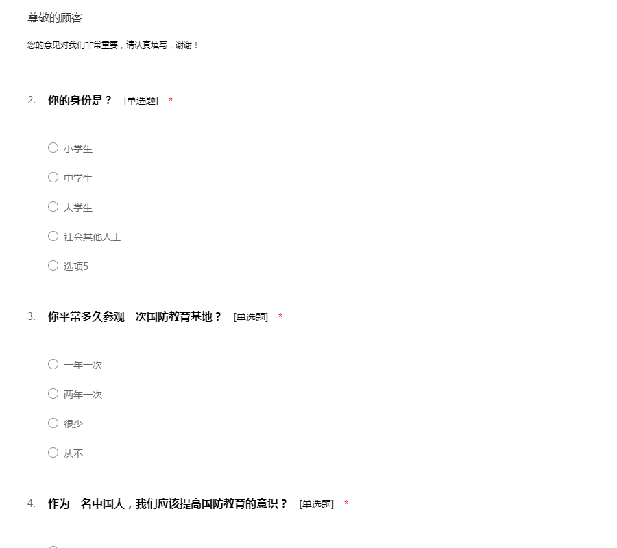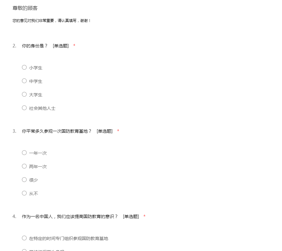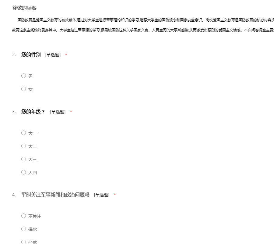 国防教育是爱国主义教育的有效载体,通过对大学生进行军事理论知识的学习,增强大学生的国防观念和国家安全意识。国防教育,能使人们进一步增强爱国主义信念,中华民族有着爱国主义的传统美德,只有激发人们对祖国的热爱,才能使他们为祖国积极献身、流血牺牲。高校爱国主义教育是国防教育的核心内容,无论是军事技能训练,还是军事理论教学,爱国主义教育这条主线始终贯穿其中。大学生经过军事课的学习,极易被国防这种关乎国家兴衰、人民生死的大事所感染,从而激发出强烈的爱国主义情感。国防教育是爱国主义教育的有效载体,通过对大学生进行军事理论知识的学习,增强大学生的国防观念和国家安全意识。国防教育,能使人们进一步增强爱国主义信念,中华民族有着爱国主义的传统美德,只有激发人们对祖国的热爱,才能使他们为祖国积极献身、流血牺牲。高校爱国主义教育是国防教育的核心内容,无论是军事技能训练,还是军事理论教学,爱国主义教育这条主线始终贯穿其中。大学生经过军事课的学习,极易被国防这种关乎国家兴衰、人民生死的大事所感染,从而激发出强烈的爱国主义情感。 国防教育是爱国主义教育的有效载体,通过对大学生进行军事理论知识的学习,增强大学生的国防观念和国家安全意识。高校爱国主义教育是国防教育的核心内容,无论是军事技能训练,还是军事理论教学,爱国主义教育这条主线始终贯穿其中。大学生经过军事课的学习,极易被国防这种关乎国家兴衰、人民生死的大事所感染,从而激发出强烈的爱国主义情感。本次问卷调查主要对我校的同学进行,了解同学们的国防意识。