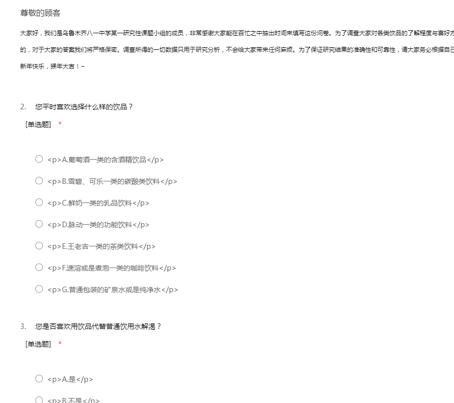 大家好,我们是乌鲁木齐八一中学某一研究性课题小组的成员,非常感谢大家能在百忙之中抽出时间来填写这份问卷。为了调查大家对各类饮品的了解程度与喜好方向,我们编制了这份问卷。这次调查是不记名的,对于大家的答案我们将严格保密。调查所得的一切数据只用于研究分析,不会给大家带来任何麻烦。为了保证研究结果的准确性和可靠性,请大家务必根据自己的实际情况如实填写。谢谢大家的合作。祝大家新年快乐,猴年大吉!~