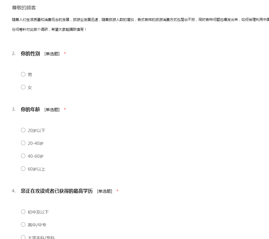 随着人们生活质量和消费观念的发展,旅游业发展迅速,随着旅游人数的增加,各式各样的旅游消费方式也层出不穷,同时各种问题也爆发出来,如何合理利用中国各地的旅游资源实现旅游业的可持续性发展,这份问卷针对此做个调研,希望大家能踊跃填写!