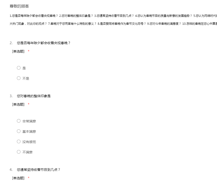 1.您是否每年除夕都会收看央视春晚? 2.您对春晚的整体印象是? 3.您通常坚持收看节目到几点? 4.您认为春晚节目的质量与新意的发展趋势? 5.您认为网络时代的来临对春晚带来的影响? 6.吐槽春晚已成为一大热门现象,对此你的观点? 7.春晚对于您而言有什么特别的意义? 8.是否赞同将春晚作为春节文化符号? 9.您对今年春晚的满意度? 10.怎样的春晚在您心中算是精彩的春晚?