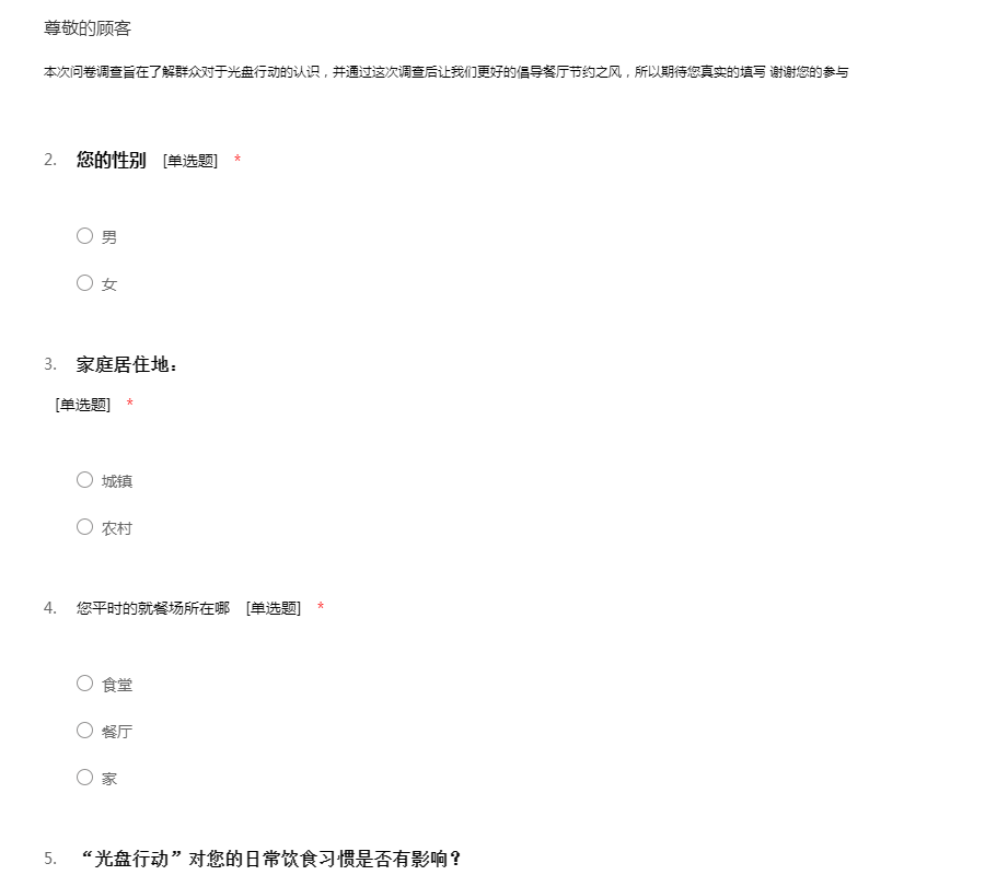 本次问卷调查旨在了解群众对于光盘行动的认识,并通过这次调查后让我们更好的倡导餐厅节约之风,所以期待您真实的填写 谢谢您的参与