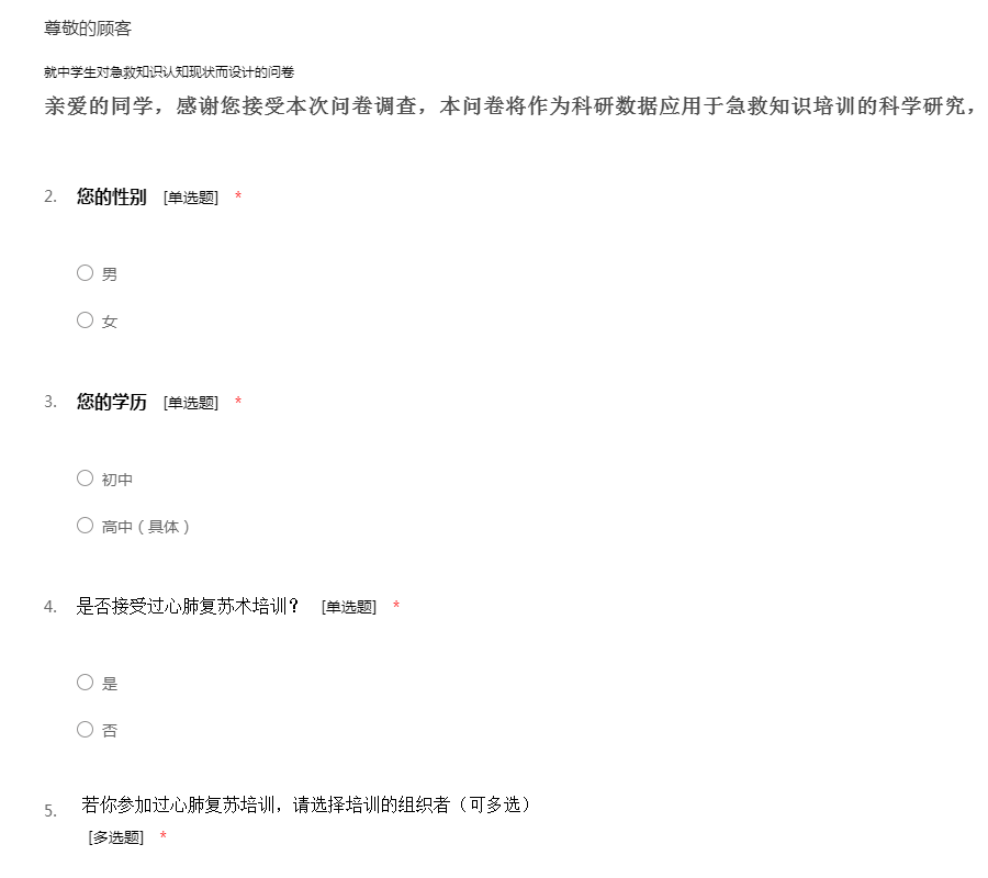 就中学生对急救知识认知现状而设计的问卷亲爱的同学,感谢您接受本次问卷调查,本问卷将作为科研数据应用于急救知识培训的科学研究,请如实进行填写。