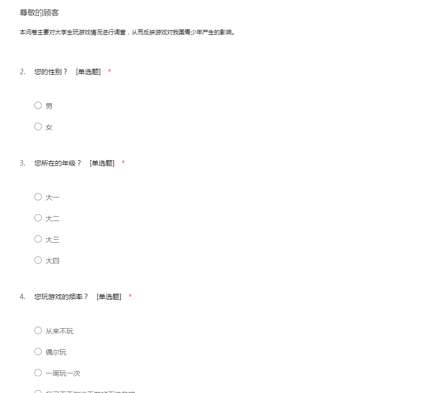 本问卷主要对大学生玩游戏情况进行调查,从而反映游戏对我国青少年产生的影响。