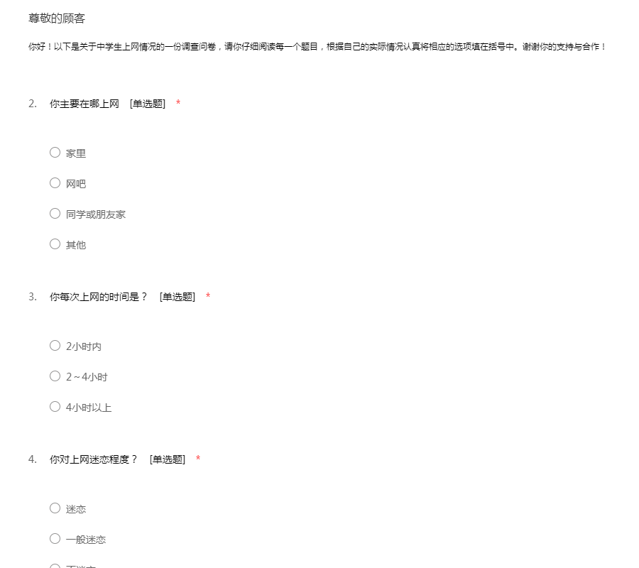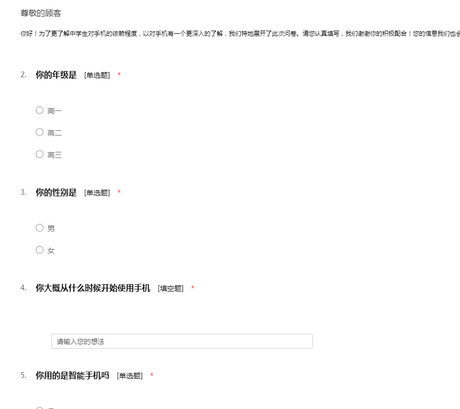 你好!为了更了解中学生对手机的依赖程度,以对手机有一个更深入的了解,我们特地展开了此次问卷。请您认真填写,我们谢谢你的积极配合!您的信息我们也会绝对保密!