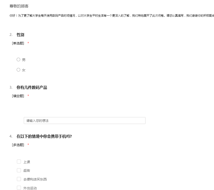 你好!为了更了解大学生每天使用数码产品时间情况,以对大学生平时生活有一个更深入的了解,我们特地展开了此次问卷。请您认真填写,我们谢谢你的积极配合!您的信息我们也会绝对保密!